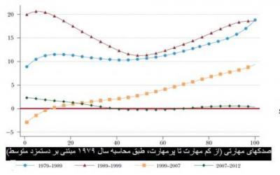 برای رسیدن به دیدی عینی از تحول الگوهای دستمزد، شکل زیر را ملاحظه کنید. محور افقی این منحنی شامل تمام انواع مشاغل – به ترتیب از پایینترین تا بالاترین سطح مهارت مورد نیاز اولیه- چنان که در دستمزدهای متوسط، که در سال 1979 محاسبه شد، منعکس است. به هر یک از این انواع ابتدا وزنی به تناسب تعداد آن نوع نسبت داده شده و سپس همۀ آنها در 100 دستۀ با اندازۀ برابر گروهبندی شدهاند. به این ترتیب این محور را میتوان محور توزیع مهارت در مشاغل تلقی کرد. محورعمودی منحنی نشاندهندۀ درصد تغییرات در دستمزدها در طول چهار دوره برای این توزیع مهارت است.