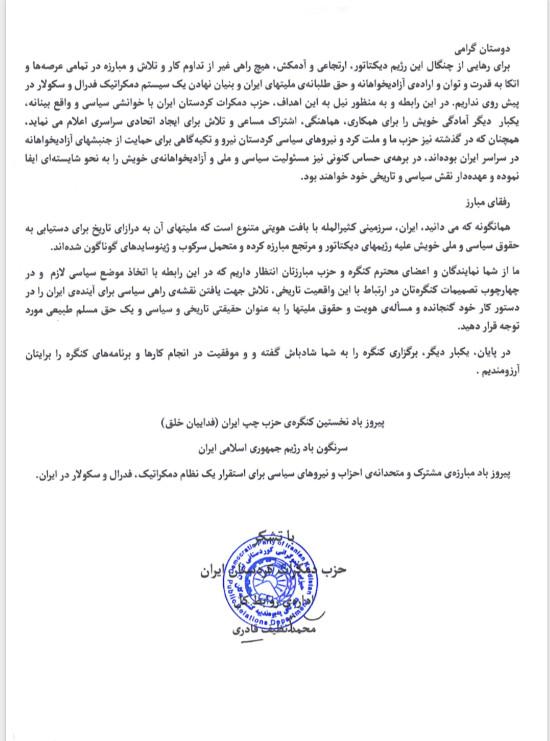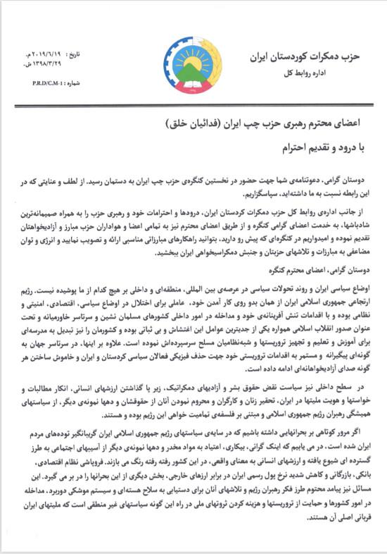 پیام حزب دمکرات کردستان ایران به نخستین کنگره حزب چپ ایران (فدائیان خلق)*