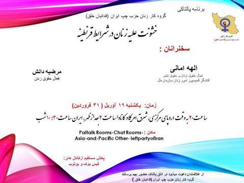 یکشنبه, 19 آوریل 2020 - 23:35 خشونت علیه زنان در شرایط قرنطینه گروه کار زنان حزب چپ ایران (فدائیان خلق) در پالتاک برگزار کرد؛ سخنرانان: الهه امانی - فعال حقوق زنان و حقوق بشر، کنشگر امور زنان در سازمان مللمرضیه دانش - فعال حقوق زنان قسمت اول قسمت دوم زنان افزودن دیدگاه جدید نام شما پست الکترونیکی محتوای این فیلد خصوصی است و به صورت عمومی نشان داده نخواهد شد. صفحه خانگی موضوع دیدگاه About text formats متن ساده خطوط و پاراگرافها بطور خودکار اعمال میشوند. نشانیهای وب و پست الکتونیکی به صورت خودکار به پیوندها تبدیل میشوند. CAPTCHA Get new captcha! چه کدی در تصویر میبینید؟ کاراکترهای نمایش داده شده در تصویر را وارد کنید. لطفا حروف را با خط فارسی و بدون فاصله وارد کنید چاپ