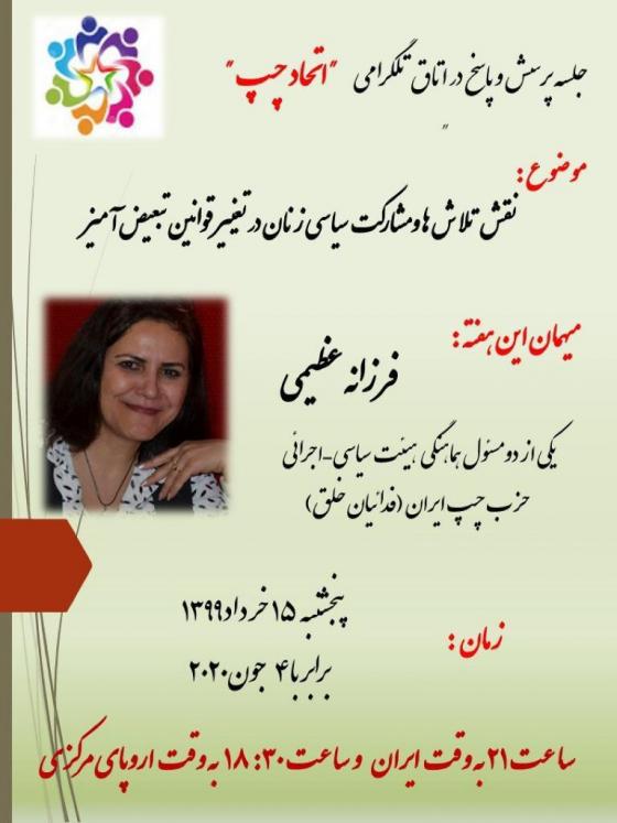 فرزانه عظیمی یکی از دو مسئول هماهنگی هیئت سیاسی-اجرائی حزب چپ ایران (فدائیان خلق) در اتاق تلگرام " اتحاد چپ" پاسخ میدهد