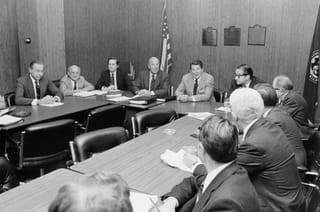 توضیح عکس: رئیس جمهور آمریکا رونالد ریگان در لس آنجلس, نوامبر ۱۹۸۰. ریگان در حال گفتگو با مشاوران اقتصادی در بارهء سیاست های جدید اقتصادی.