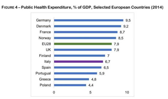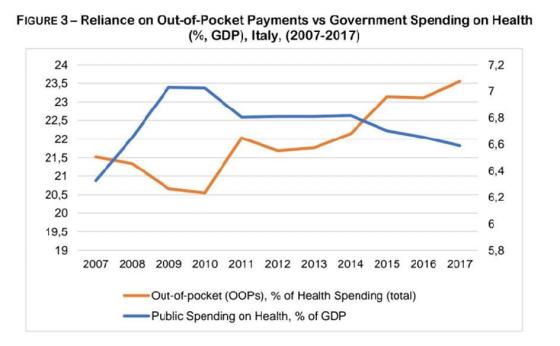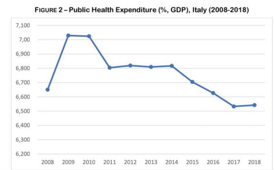 طی سالهای 10-2008 ایتالیا صرف هزینههای بهداشت عمومی را متوقف کرد. در واقع متوسط رشد سالانهی هزینههای بهداشتی بین سالهای 2007-2000 شش درصد کاهش یافت. (La Repubblica2013). همانطوریکه در نمودار 2 در سال 2010 میبینید. مخارج بهداشتی ایتالیا سیر مثبت ده سالهی خود را رها و شروع به کاهشی شدید و دائمی کرد(DEF, 2017 ). در همان زمان بودجه برای داروهای ضروری و صندوق ملی بهداشت کاهش یافت. بهطوریکه در 2012 بالغ بر 4.15 بیلیون یورو کمتر صرف شد. همچنین پرداخت هزینهی مشارکتی اضافی برای داروهای سرپایی و ویزیت متخصصین در دورهی «2007-2015» 53.7 درصد رشد یافت(نتیجهی آمارگیری 2018). در همین حال بودجه برای تضمین داروهای رایگان 660 میلیون یورو کاهش یافت و صرف هزینه برای بیمارستان ها 880 میلیون یورو کمتر شد. به اضافهی اینکه وزارت اقتصاد و دارائی ایتالیا اخیراً پیشبینی کرد که هزینههای بهداشتی در دوره مالی 2020-2018 به 6.4 درصد از GDP کاهش خواهد یافت.( DEF 2017)ِ. حتی وقتی بیشتر نگرانکننده است که سطح هزینههای بهداشت عمومی ایتالیا را با سایر کشورهای اروپایی مقایسه کنیم. در واقع ایتالیا بسیار بدتر از کشورهایی مانند فرانسه و آلمان که تولید ناخالص داخلی همانندی دارند عمل میکند.