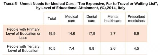 کاهش مستقیم بودجه، تاثیر قابل توجهی در دسترسی به بهداشت خواهد داشت. اگرچه این اثر برای گروههای محروم جامعهی ایتالیا بسیار بیشتر بود، در حالی که برای آنهایی که وضع مالی خوبی داشتند، تغییر چندانی در دسترسی به بهداشت در زمان بحران پیش نیامد. این بخش به بررسی جزییات چگونگی تفاوتها از نظر اقتصادی، اجتماعی، کار، وضعیت تحصیلی و کشور مبدا و ارتباط آن با موانع کمتر یا بیشتر در دسترسی به بهداشت و درمان میپردازد.
