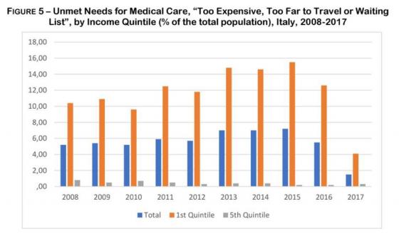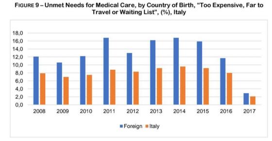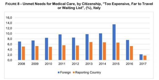 سرویس ملی بهداشت ایتالیا NHS برای همهی ساکنان قانونی و مهاجرانی که مجوز دارند مراقبتهای بهداشتی مجانی ارائه میدهد. اگرچه شهروندان ایتالیایی و خارجیان طبق آمار اتحادیهی اروپا در دسترسی به بهداشت و درمان متفاوتاند. همانطوریکه نمودار 8 نشان میدهد، این تفاوتها در طول بحران عمیقتر شده و در 2015 به بالاترین حد خود رسیده و در 2017 به طور قابل ملاحظهای کاهش یافته است.