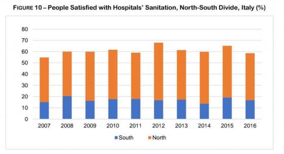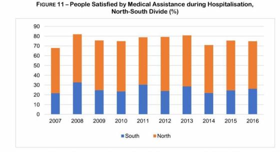 درصد مردمی که از مراقبتهای بهداشتی رضایت دارند، شکاف بین مناطق شمال و جنوب ایتالیا را آشکار میکند. به طور مثال در 2013 65.3 % از مردم در جنوب اعلام کردند که از آخرین ویزیت متخصص خود راضی بودند در حالیکه در شمال 77.2%بود ( ISTAT,2015b). این شکاف هنگامی که به میزان رضایت برای سرویسهای بهداشتی در داخل بیمارستانها مراجعه کنیم دائماً گستردهتر میشود. پنجاه و یک درصد از افراد در شمال در سال 2012 رضایت داشتند درحالی که این نسبت در جنوب شانزده و نه درصد بود. این روند ها در نمودارهای 9 و 10 نشان داده میشود. جریان مشابهی را میتوان در مورد کمکهای پزشکی و مهد کودکها در طول بستری شدن در شمال و جنوب مشاهده کرد.