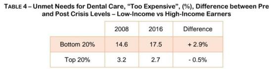 نیازهای برآورده نشده برای مراقبت از دندان، الگوی مشابهی را نشان میدهد. همانگونه که در جدول 4 و نمودار 6 دیده میشود، میتوان دریافت که این نیازها به دلایل مالی برای کم درآمدترین مردم 3% رشد کرده است. در حالی که برای در آمدهای بالاتر حتی پنج دهم درصد کمتر شده است.