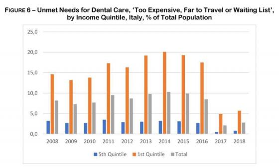 نمودار 6 نیازهای انجام نشدهی دندانپزشکی را به دلایل مختلف در طول زمان نشان میدهد. این نمودار نشان میدهد که در سال 2008، چهارده و شش دهم درصد از فقیرترین ایتالیائیها نتوانستند هزینه دندانپزشکی را بپردازند. این تعداد در سال 2014 به بیست و یک دهم درصد رسید و 17.5 درصد در 2016 باقی ماند. اما برای آنهایی که درآمدهای بالای خود را گزارش کردهاند، در طول بحران تفاوت و افزایش چندانی ایجاد نشد. توجه ویژهای باید به افراد مسن کرد، زیرا برای دسترسی به مراقبتهای دندانی موانع زیادی دارند. در واقع طی گزارشی که توسط ادارهی ملی آمار ایتالیا منتشر شد، فقط 29.2 % از مردمان بالای 75 سال در 2015 به مراقبتهای دندانپزشکی دسترسی داشتند. درحالیکه میانگین اروپایی آن 45.3 % است.( ISTAT,2015a )