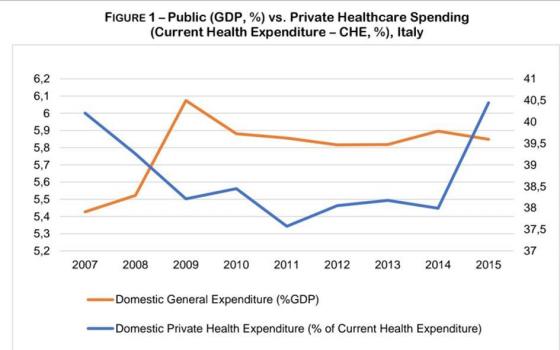 در راستای این سنگرسازی جدید جهانی برای هزینههای عمومی، مخارج بهداشتی ایتالیا در دورهی 2008 تا 2010 کاهش یافت. در همان زمان هزینههای مراقبتهای بهداشتی خصوصی شروع به افزایش کرد. این تغییر در سهام عمومی و خصوصی هزینههای بهداشتی با جزییات بیشتری تجزیه و تحلیل خواهد شد.
