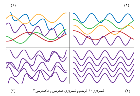 (۲) امواج در این شکل دارای جهت مشترک، طول موج مختلف، لذا از نظر زمانی ناهمدوس اما فضایی همدوس هستند.
