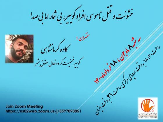 دوشنبه, 7 ژوئن 2021 - 14:24 خشونت و قتل ناموسی افراد کوییر، بی شمار اما بی صدا سخنران کاوه کرمانشاهی کوییر فمنیست کرد و فعال حقوق بشرسه شنبه 18 خرداد ماه 1400 برابر با 8 ژوئن 2021 ساعت ۲۱ به وقت ایران – ۱٨:۳۰ به وقت اروپای مرکزی زنان افزودن دیدگاه جدید نام شما موضوع دیدگاه About text formats متن ساده خطوط و پاراگرافها بطور خودکار اعمال میشوند. نشانیهای وب و پست الکتونیکی به صورت خودکار به پیوندها تبدیل میشوند. CAPTCHA Get new captcha! چه کدی در تصویر میبینید؟ کاراکترهای نمایش داده شده در تصویر را وارد کنید. لطفا حروف را با خط فارسی و بدون فاصله وارد کنید چاپ
