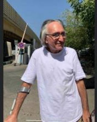 حال او باقامتی تکیده ،چهره ای شکسته وپیر شده که نشان از پای سنگین گذر دژخیمان بر جسم او دارد، پیکر نحیف خود برعصای دستی حمایل کرده ودر مقابل در زندان ایستاده است.