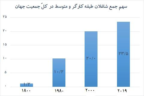 در سال 2019 طبقهی کارگر (ماهر و کمترماهر، در فرایند تولید و گردش) 52.3% کل شاغلان و بیکاران جهان را تشکیل میداد. در همان سال حداقل تخمین طبقهی متوسط در میان دو طبقهی عمدهی نظام اقتصادی جهان، کارگران و سرمایهداران، %4.3 و طبقهی خردهبورژوازی همراه با کارکنان فامیلی بدون مزد (که اکثر آنان زحمتکش و فقیرند) 40.4% کل شاغلان را در بر میگرفتند (ج 1.2).