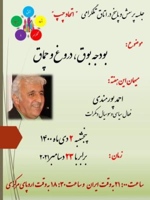چهارشنبه, 22 دسامبر 2021 - 20:12 بودجه بوق، دروغ و چماق https://t.me/joinchat/SO5itGarea0c4bwe اطلاعیهها و فراخوانها افزودن دیدگاه جدید نام شما پست الکترونیکی محتوای این فیلد خصوصی است و به صورت عمومی نشان داده نخواهد شد. صفحه خانگی موضوع دیدگاه About text formats متن ساده خطوط و پاراگرافها بطور خودکار اعمال میشوند. نشانیهای وب و پست الکتونیکی به صورت خودکار به پیوندها تبدیل میشوند. CAPTCHA Get new captcha! چه کدی در تصویر میبینید؟ کاراکترهای نمایش داده شده در تصویر را وارد کنید. لطفا حروف را با خط فارسی و بدون فاصله وارد کنید چاپ