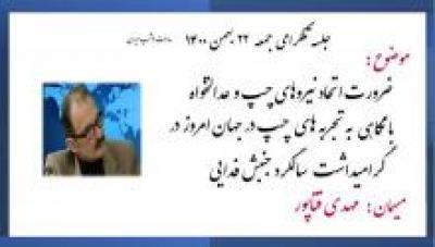 بادرودرفیق مهدی عزیز، باتوجه به طرح برخی دیدگان های گوناگون از سوی بخش مهمی از گروه هاواحراب چپ، که پایه وشرط اتحاد را نه براساس واقعیات عینی موجودوفلاکتبارحاکم برمیهن ،وبرآمد اعتراضی طبقات واقشار مبارز درمیدان واقعی مبارزه،بلکه با قرار گرفتن درپشت دیواری از ذهنیت مجرد وانتزاعی باموکول نمودن شرکت دراتحاد بلوک نیرومند چپ ازپیش آنرا مشروط به حل اختلافات تئوریک میدانندنه نقاط اشتراک، وآنهم درحالیکه هریک ازآنان خودرا تنها نماینده حزب طبقه کارگرمعرفی میکنند، آیا تااین ذهنیت غیر واقعی از تحلیل شرایط ،واتکاء به اندیشه های جزم گرایانه حل نشود، امیدی به اتحاد نیرومند چپ وجوددارد؟، درحالیکه دراین لحظات تاریخی ،مبرم ترین اقدام جهت بیراهه نرفتن جنبش انقلابی تشکل واتحاد نیروی چپ، ودرنهایت وحدت آنهاست.