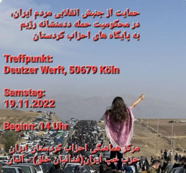 ضمن حمایت از جنبشانقلابی مردم ایران که تا کنون بیش از ۱۵ هزارتن دستگیر و زندانی شدند و ۳۳۰ هموطن ما توسط رژیم سرکوب گر جمهوری اسلامی به قتل رسیدند که در میان کشته شدگان اسامی ۵۳ کودک سندی ماندگار از شدت برخورد ددمنشانه ی مزدوران جنایت کار رژیم است و در محکومیت بمباران پایگاه های احزاب کردستان ایران اعلام می داریم: در تظاهرات شنبه ۱۹ نوامبر ساعت ۱۴ شرکت خواهیم کرد تا صدای مردم آزادی خواه و عدالت طلب کشورمان را به دولت، مجلس و مردم آلمان به خصوص در شهر کلن برسانیم.
