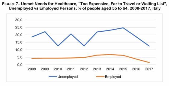 منحنی 7 نشان میدهد که در طول بحران، اعلام نیازهای برآورده نشدهی مردم بیکار ایتالیائی نسبت به افراد شاغل بسیار بالاتر بوده است. به طور مثال در 2008 این نیازها برای سنین 55 تا 65 سهبرابر شاغلین بوده است. این نابرابری در طول دوره 17-2008 گستردهتر شده، اما برای شاغلین فقط کمی افزایش داشته است.