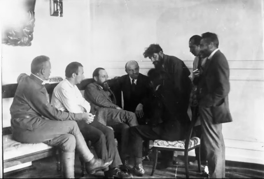 سلطانزاده در میان جمعی که با لنین مباحثه می کنند.