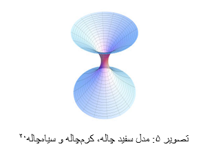 گفتیم که تراکم بسیار بالای ماده سبب انحنای فضازمان میشود. انحنای فضازمان میتواند به دو شکل صورتگیرد (تصویر۵): به شکل انحنای مثبت و یا منفی. انحنای مثبت، صادق در مورد سیاهچالهها، زمانی پیش میآید که چگالی مادهی مثبت بسیار بالاست. یعنی، از ذراتی مانند پروتونها (ماده) و پادپروتونها (پادماده)۳ تشکیل شده است. انحنای منفی، صادق در مورد سفیدچالهها، را وقتی داریم که ماده از نوع مادهی منفی۴ باشد. هرچه تراکم ماده، چه مثبت و چه منفی، بیشتر باشد خمیدگی فضازمان نیز شدیدتر است. در حالت خمیدگی حداکثری فضازمانِ بین سیاهچالهها و سفیدچالهها، کرمچالهها را خواهیم داشت.۲۱و۲۲کرمچالهها به تعبیری تونلی بسیار باریک (سوراخی) بین نواحی مختلف کیهان و یا بقولی بین کیهانها هستند(؟). تصور میشود مادهای که وارد یک سیاهچاله شد پس از گذر از تونل، از کرمچاله، از آن طرف توسط سفیدچاله به بیرون پرتاب میشود.
