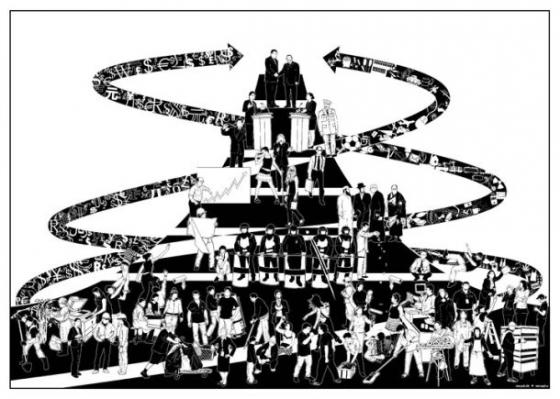 و: «آن طبقات و زیرطبقاتی که معیشتشان بهطور مستقیم از محل کارشان ناشی نمیشود پرشمارتر میشوند و بهتر از قبل زندگی میکنند، و شمار کارگران نامولد نیز افزایش مییابد.» (همان)