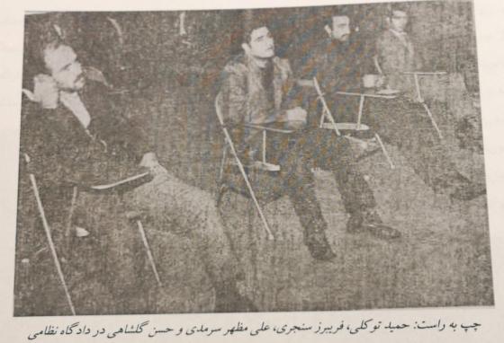 بعد از آنکه ساواک در برنامه خود برای تشکیل دو دادگاه بزرگ شکست خورد تصمیم به شکستن این دو بخش گرفت و از دادگاه نظامی خواست تا افراد را در جمعهای کوچکتر محاکمه کند. دسته ما چهار نفر بود مرکب از حمید توکلی، فریبرز سنجری، علی مظهر سرمدی و من. من و علی هم تیم و هم پرونده بودیم و ربطی به پرونده حمید و فریبرز نداشتیم. همانطور که فعالیت آن دو در بیرون جدا از همدیگر بود. اشتراک ماها در این پرونده را فقط متعلق بودنمان به "چریک فدائی" توضیح میداد! کل دادگاه نیم ساعت هم طول نکشید و حکم را خواندند. به حمید توکلی حکم اعدام دادند و ما سه نفر حبس ١٥ سال تا ابد گرفتیم.