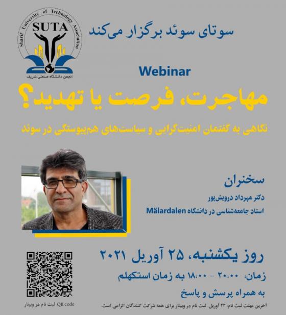 مهاجرت، فرصت یا تهدید” عنوان سخنرانی بعدی از سلسله سمینارهای سوتای سوئد می باشد. شرکت در این سخنرانی که بنا به محدودیتهای مربوط به پاندمی به صورت آنلاین و یا اصطلاحا به صورت وبینار انجام می شود برای کلیه علاقمندان به این موضوع آزاد بوده ولی مسلما به توجه به محدودیتهای فنی، اولویت شرکت در این سخنرانی برای اعضای رسمی سوتای سوئد می باشد. این سخنرانی که نگاهی ژرف، علمی و متفاوت به مقوله گفتمان امنیت گرایی و سیاست های همپیوستگی در سوئد و دیگر کشورها دارد توسط دکتر مهرداد درویش پور، استاد جامعه شناسی در دانشگاه ملردالن سوئد و مولف چندین کتاب مرتبط در این زمینه، ارائه خواهد شد.