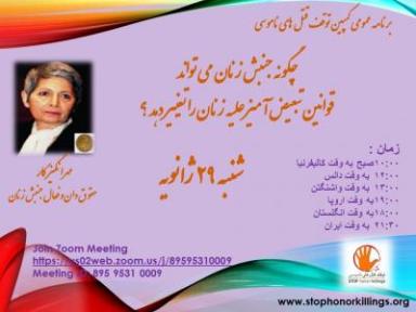شنبه, 5 فوریه 2022 - 01:30 برنامه زوم کمپین توقف قتل های ناموسیچگونه جنبش زنان میتواند قوانین تبعیضآمیز علیه زنان را تغییر دهد؟سخنران : مهر انگیز کار گفتمان افزودن دیدگاه جدید نام شما موضوع دیدگاه About text formats متن ساده خطوط و پاراگرافها بطور خودکار اعمال میشوند. نشانیهای وب و پست الکتونیکی به صورت خودکار به پیوندها تبدیل میشوند. CAPTCHA Get new captcha! چه کدی در تصویر میبینید؟ کاراکترهای نمایش داده شده در تصویر را وارد کنید. لطفا حروف را با خط فارسی و بدون فاصله وارد کنید چاپ