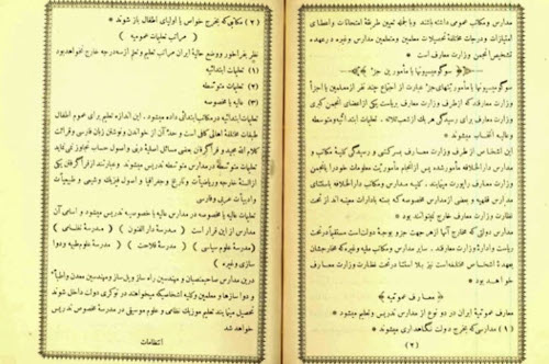 "تأسیس مدارس به مخارج دولتی و ملتی و تحصیل اجباری باید مطابق قانون وزارت علوم و معارف مقرر شود و تمام مدارس و مکاتب باید در تحت ریاست عالیه و مراقبت وزارت علوم و معارف باشد."