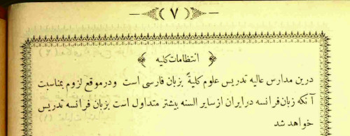در نظامنامه آموزش با عنوان «انتظامات کلیه» آمده است: در این مدارس عالیه تدریس علوم کلیتاً به زبان فارسی است و در موقع لزوم به مناسبتِ آنکه زبان فرانسه در ایران از سایر السنه بیشتر متداول است به زبان فرانسه تدریس خواهد شد.