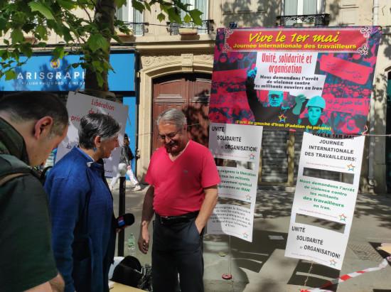 فعالین حزب چپ ایران(فدائیان خلق) فرانسه در مسیر حرکت راهپیمایان با بر پائی میز و نصب شعار ها و پوستر بزرگ شده حزبمان و پخش موزیک در این تظاهرات شرکت کردند،شعار ها وبخصوص پوستر حزب چپ ایران (فدائیان خلق) مورد توجه بسیار قرار گرفت. رفقای ما همچنین اقدام به پخش متن فرانسه اعلامیه بزرگداشت اول ماه مه حزب و ترجمه «خواسته های کمیته هماهنگی بین سندیکائی ایران »کردند . تمامی شعار های ستاد برگزاری اول ماه حزب به زبان فرانسه و نیز ده شعار عمومی و کارگری به زبانهای فارسی و فرانسه به نمایش گذاشته شد.