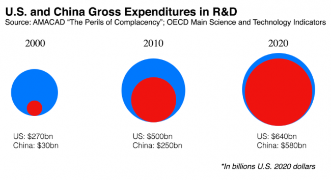 اما آنچه که روشن است، ایالات متحده آمریکا به تنهایی قادر نیست سیاست مهار چین را به اجرا درآورد. در فاصله 40 سال گذشته اقتصاد آمریکا در نبرد اقتصادی با چین میدان های زیادی را از دست داده و اقتصاد چین روز به روز به نقطه برابری با آمریکا نزدیک شده و بر اساس پیش بینی ها در آینده نزدیک در عرصه های زیادی از اقتصاد آمریکا جلو زده و خواهد زد. برای نمونه نمودار شماره 7، (20) رشد سریع خالص بودجه مصرفی در زمینه تحقیقات و توسعه را نشان می دهد. چین که در سال2000 تنها یک نهم آمریکا در این زمینه اختصاص داده است، در سال 2020 با 580 میلیارد دلار در مقابل 640 میلیارد دلار آمریکا ، تنها 10% کمتر از آمریکا به این امر اختصاص داده است. روندی که نشان دهنده سبقت گیری در آینده نزدیک از سوی چین است.