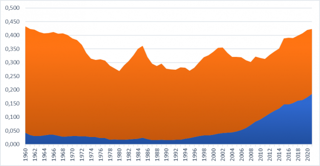 مقایسه توان اقتصادی بین بلوک نظام های لیبرال دمکراسی و بلوکی دولت های اقتدار گرا، شامل چین، روسیه و ..، هنوز نشان از برتری اردوگاه لیبرال دمکراسی دارد. برتری ای که با چرخیدن کفه ترازو به نفع اردوگاه اقتدار گرا، به چالش کشیده شده است. در فاصله سال های بین 1980 تا 2021 اگر چه مجموعه تولید ناخالص داخلی G7 از 6930330 میلیارد دلار به 42371612 میلیارد دلار رسید ؛ اما سهم آن از کل تولید خالص جهانی از 61،1% به 44،09 %کاهش یافته است. در این فاصله زمانی تنها سال 1993 بود که این بلوک بیشترین سهم را با 67،4 % به خود اختصاص داده بود، ولی در مجموع روند به ضرر بلوک نظام های لیبرال دمکراسی، طی شده است. در مقابل تولید ناخالص ملی چین در همین بازه زمانی از 360857 به 17734063 میلیارد دلار رسیده و سهم آن از 1،7% به 18،45% افزایش پیدا کرده است. به عبارت دیگر اگر تولید ناخالص داخلی بلوک معروف به هفت کشور تنها 6،11 برابر شد، در مقابل تولید ناخالص داخلی چین در همین بازه زمانی 92،78 برابر افزایش داشته است. در سال 1990 مجموع تولید ناخالص داخلی بلوک هفت کشور بیش از 41 برابر تولید ناخالص چین بود؛ این برابری در سال 2021 تنها به 2،39 برابر رسیده است. این آمار و ارقام نشان روشنی از روند تغییرات به نفع چین دارد. ( جزئیات بیشتر در جدول شماره 1. و (27 و 28) نمودارهای شماره 11و 12