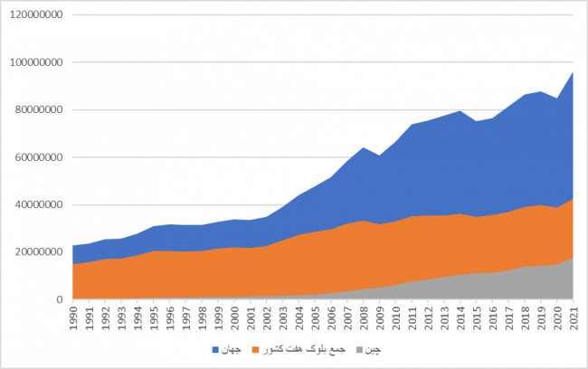 جدول شماره 1 . مقایسه تولید ناخالص بین G7 و چین. 1990 تا 2021