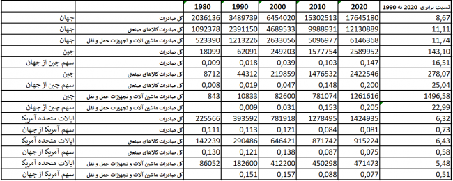 چین دومین قدرت اقتصادی دنیا و بزرگترین اقتصاد صادرات محور دنیا ست. در سال 2009 چین با 1201،612 میلیارد دلار، در مقابل 1120،041 میلیارد دلار صادرات سالانه، از آلمان سبقت گرفته و از آن زمان تا کنون رتبه اول جهانی خود را حفظ کرده است. سهم چین از کل صادرات دنیا از زیر یک درصد ( 0089، 0 درصد) در سال 1980 ( مجموعا 18،42میلیارد دلار) به 14،74 درصد( مجموعا 2499،029میلیارد دلار) در سال 2020 رسیده است. یعنی 140 برابر افزایش داشته است. این مقایسه را اگر در جزئیات مورد بررسی قرار دهیم با نسبت های سرگیجه آوری روبرو خواهیم شد. در مدت زمان مورد بررسی؛ در حالیکه حجم صادرات جهانی؛ کل کالای تولیدی ــ صادراتی جهانی؛ و کل صادرات جهانی ماشین آلات و ... به ترتیب 8،7؛ 11،1 و 11،7 برابر شده است؛ همین برابری برای چین 143،1؛278،1 و 1498،6 برابر شده است. (3) (جدول شماره 2) طی این مدت زمان چین مازاد تجاری ای بالغ بر 5323،844 میلیارد دلار کسب کرده است. (7). (جدول شماره 4)