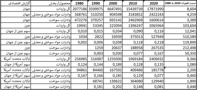 با نگاهی به دو جدول شماره 2 و 3؛ در حالیکه در فاصله 41 سال (1980 تا 2020) حجم واردات و صادرات جهانی بترتیب، 8،6 و 8،7 برابر شده است، چین توانسته است طی این دوره میزان صادرات و واردات خودرا، 103،2 و 143،1 برابر افزایش دهد. آنچه که باید مورد توجه قرار گیرد و در این دو جدول به خوبی قابل رویت است، افزایش بی سابقه حجم واردات سوخت و دیگر مواد معدنی است. افزایشی 510،6 برابری مواد معدنی و سوخت ، و افزایشی212،5 برابری سوخت. طی همین بازه زمانی سهم واردات سوخت و مواد معدنی چین به کل جهان از زیر 1% ( 0،002) به بیش از 21 % رسیده است. چین با سهمی حدود 50 % از کل جهان، بزرگترین مصرف کننده ذعال سنگ در دنیا است. ذغال سنگی که باید در آینده نزدیک با دیگر حامل های انرژی زا ( بخصوص گاز) جایگزین گردد. چین با 527949 میلیارد دلار واردات مواد معدنی و سوختی ( سال 2020 . منبع سازمان تجارت جهانی) به بزرگترین وارد کننده مواد خام جهان، و نفت و گاز ( از میانه سال 2016 با پشت سر گذاشتن آمریکا به بزرگترین وارد کننده سوخت در جهان شده است. تبدیل شده است. چین حدود 20% نفت جهان را خریداری می کند. اگر رقم 527949 میلیارد دلار واردت مواد خام معدنی چین را با رقم 185778میلیارد دلار، میزان واردات کشور آمریکا، مقایسه شود، برنقش مواد خام و معدنی وارداتی درحیات اقتصادی چین بیشتر واقف می شویم. (4) جدول شماره 3