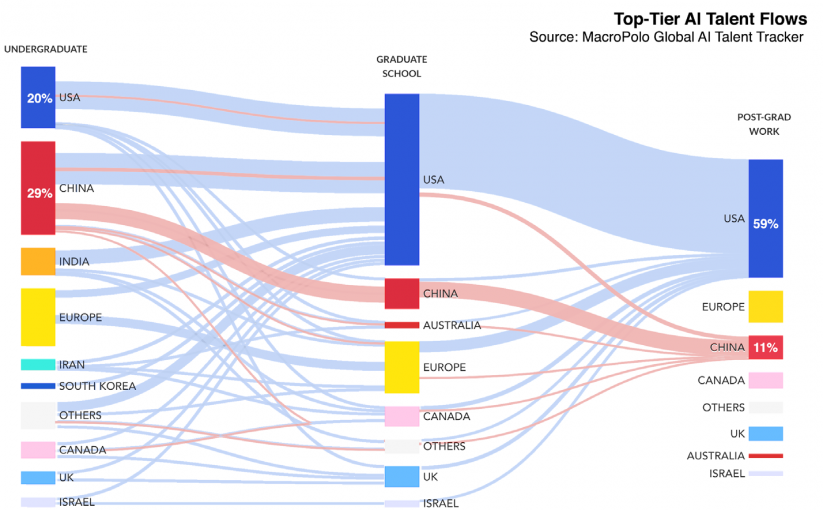 چین چهار برابر آمریکا خروجی تحصیل کرده دانشگاهی در چهار رشته ریاضیات، انفورماتیک، علوم طبیعی و تکنیک دارد ( چهار رشته معروف به MINT. Mathematik, Informatik, Naturwissenschaft Technik ) و در برنامه دارد تا سال 2025 دو برابر دکترا در رشته های معروف به STEM (science, technology, engineering and mathamatics) فارق التحصیل داشته باشد، با این حال، ایالات متحده از دو مزیت در عرصه سرمایه انسانی برخوردار است که پکن نمی تواند در این عرصه با آن رقابت کند. اول اینکه نیمی از فوق ستاره ها در رشته هوش مصنوعی در شرکت های آمریکایی بکار مشغول هستند. دوم اینکه آمریکا از همه 7،9 میلیون جمعیت جهان نیرو متخصص را به استخدام خود در می آورد. نتیجه اینکه نیمی از انفورماتیکرهای مشغول بکار در آمریکا با تحصیلات بالای دانشگاهی در خارج از آمریکا بدنیا آمده اند. جدا از این 80% دکترای هوش مصنوعی حداقل 5 سال بعد از فارق التحصیلی در آمریکا باقی می مانند. بیش از 90 درصد دانشجویان خارجی از کشورهای تایوان، هند،ایران و چین در آمریکا باقی می مانند. در حالیکه تنها 20% چینی هایی که[ در خارج از چین]فارق التحصیل شده اند به چین بر می گردند. (18)