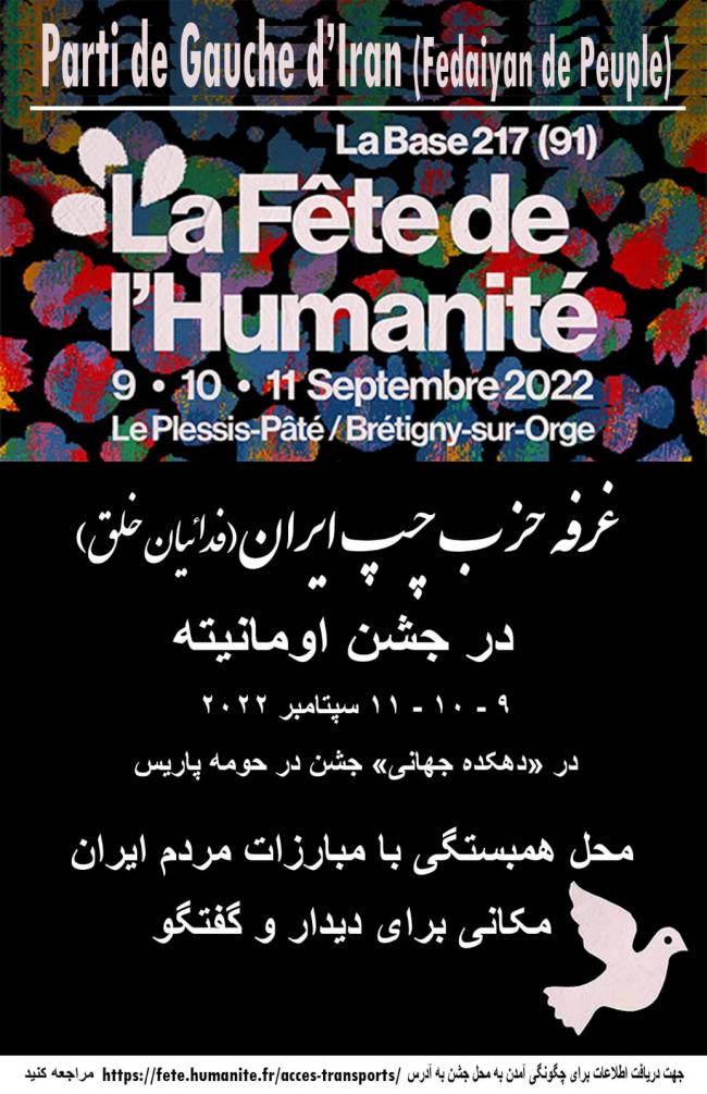 دوشنبه, 5 سپتامبر 2022 - 09:17 دعوت بە بازدید از غرفە حزب چپ ایران(فدائیان خلق) در جشن اومانیتە زمان روزهای ٩-١٠ و ١١ سپتامبر ٢٠٢٢مکان دهکدە جهانی واقع در حومە پاریسمحلی برای همبستگی با مبازات مردم ایران و دیدار و گفتگو اطلاعیهها و فراخوانها افزودن دیدگاه جدید نام شما پست الکترونیکی محتوای این فیلد خصوصی است و به صورت عمومی نشان داده نخواهد شد. صفحه خانگی موضوع دیدگاه About text formats متن ساده خطوط و پاراگرافها بطور خودکار اعمال میشوند. نشانیهای وب و پست الکتونیکی به صورت خودکار به پیوندها تبدیل میشوند. CAPTCHA Get new captcha! چه کدی در تصویر میبینید؟ کاراکترهای نمایش داده شده در تصویر را وارد کنید. لطفا حروف را با خط فارسی و بدون فاصله وارد کنید چاپ
